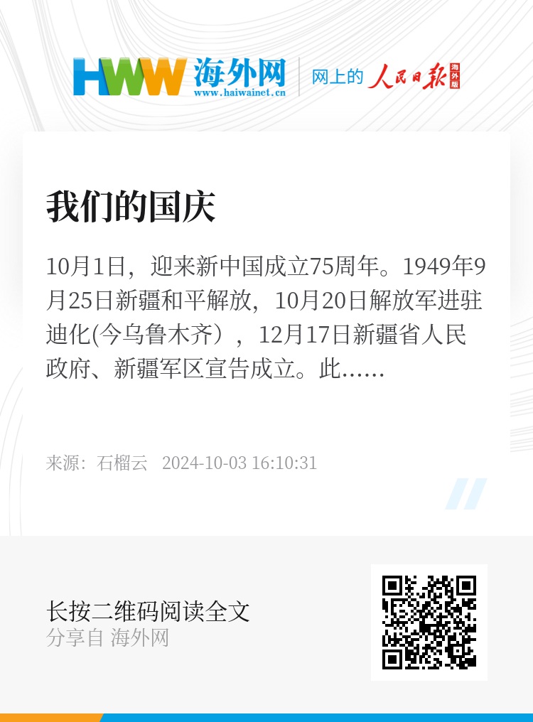 10月1日,迎来新中国成立75周年。1949年9月25日新疆和平解放,10月20日解放军进驻迪化(今乌鲁木齐),12月17日新疆省人民政府、新疆军区宣告成立。此后的每个国庆节,新疆群众都以热烈隆重的方式庆祝,表达对祖国的祝福。