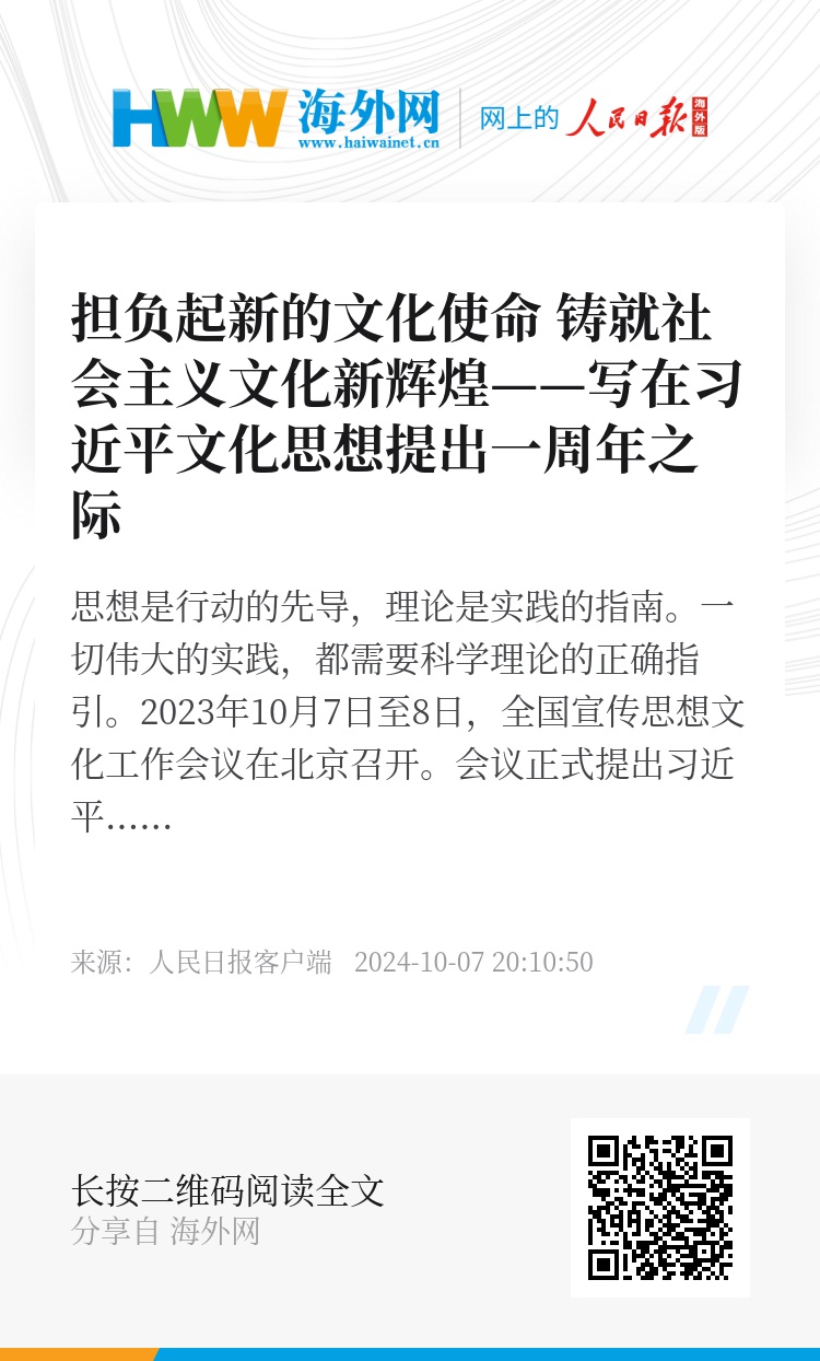 习近平文化思想激励着全党全国各族人民担负起新的文化使命,为强国建设、民族复兴作出新的更大贡献。