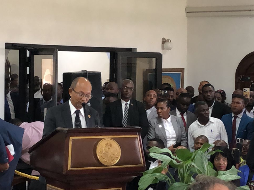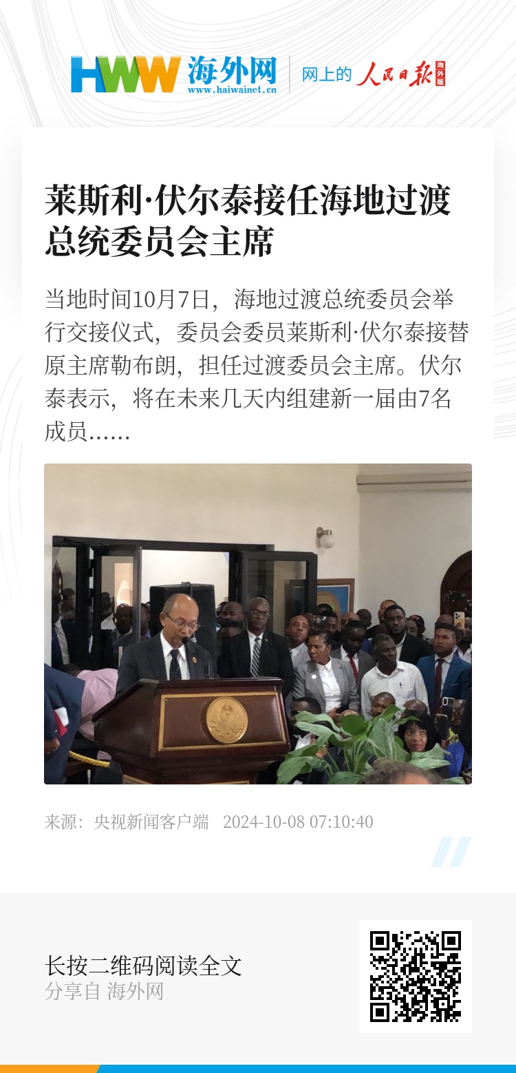 当地时间10月7日,海地过渡总统委员会举行交接仪式,委员会委员莱斯利·伏尔泰接替原主席勒布朗,担任过渡委员会主席。