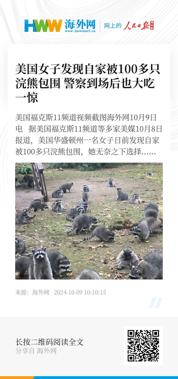 海外网10月9日电 据美国福克斯11频道等多家美媒10月8日报道,美国华盛顿州一名女子日前发现自家被100多只浣熊包围,她无奈之下选择报警。