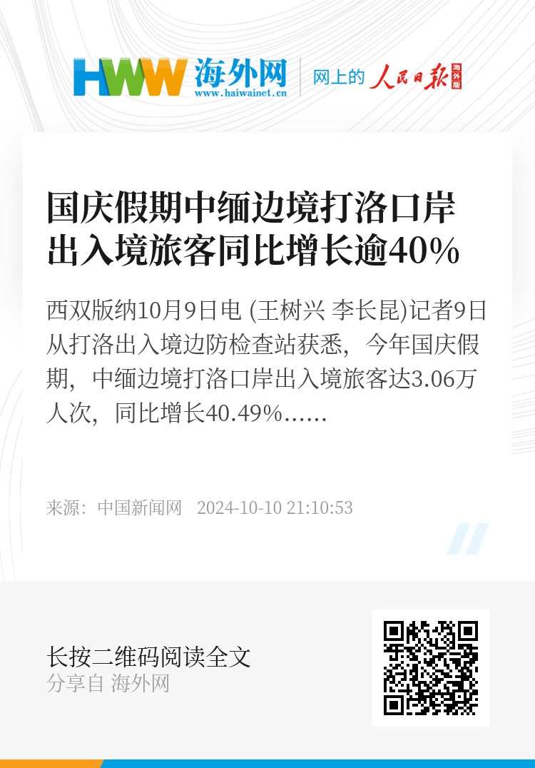 中新网西双版纳10月9日电 (王树兴 李长昆)记者9日从打洛出入境边防检查站获悉,今年国庆假期,中缅边境打洛口岸出入境旅客达3.06万人次,同比增长40.49%。