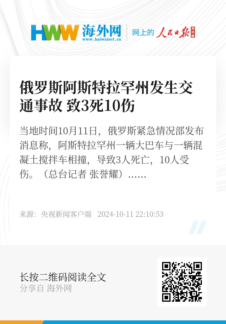 当地时间10月11日,俄罗斯紧急情况部发布消息称,阿斯特拉罕州一辆大巴车与一辆混凝土搅拌车相撞,导致3人死亡,10人受伤。(总台记者 张誉耀)