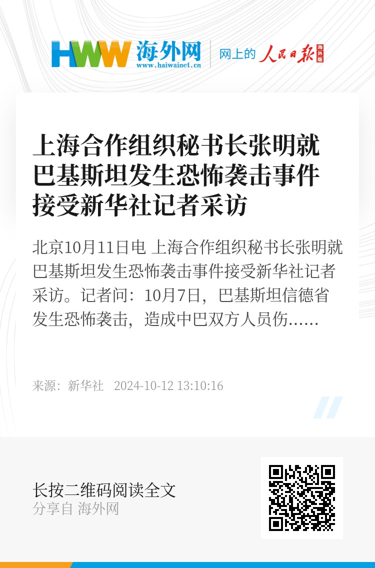 新华社北京10月11日电 上海合作组织秘书长张明就巴基斯坦发生恐怖袭击事件接受新华社记者采访。