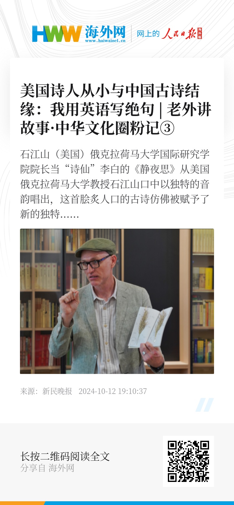 少年时背诵古诗,青年时翻译古诗,二十岁出头开始探索用英语创作绝句,并在接下来的二十多年时间中建立起英语绝句的体系,向英语世界传授写作方法——如何用英语实现中国绝句中的平仄、对仗、起承转合……美国人石江山与中国古诗的缘分成就了他的事业。