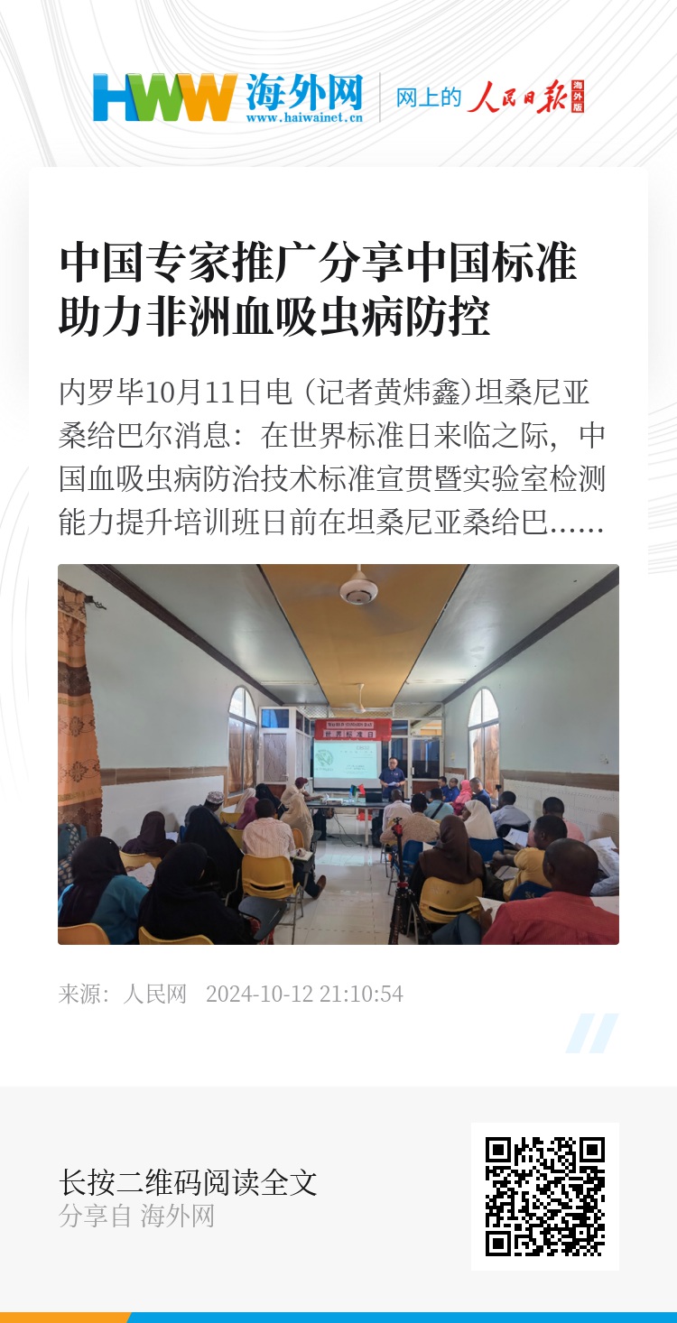 人民网内罗毕10月11日电 (记者黄炜鑫)坦桑尼亚桑给巴尔消息:在世界标准日来临之际,中国血吸虫病防治技术标准宣贯暨实验室检测能力提升培训班日前在坦桑尼亚桑给巴尔地区奔巴岛举行。培训班由中国援助桑给巴尔血吸虫病防治技术项目专家组与桑给巴尔奔巴岛疾病预防控制机构合作举办,来自当地各级疾控机构及医院的80余名医护人员、实验室技术人员参加培训。