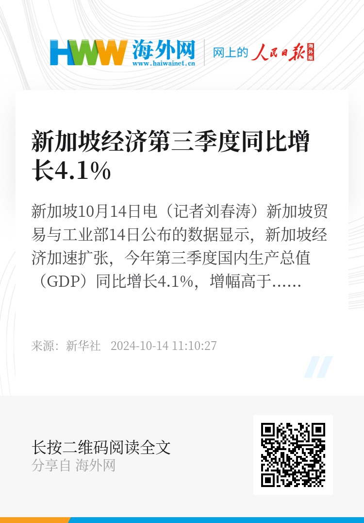 新华社新加坡10月14日电(记者刘春涛)新加坡贸易与工业部14日公布的数据显示,新加坡经济加速扩张,今年第三季度国内生产总值(GDP)同比增长4.1%,增幅高于第二季度的2.9%;经季节性调整,环比增长2.1%,增幅高于第二季度的0.4%。