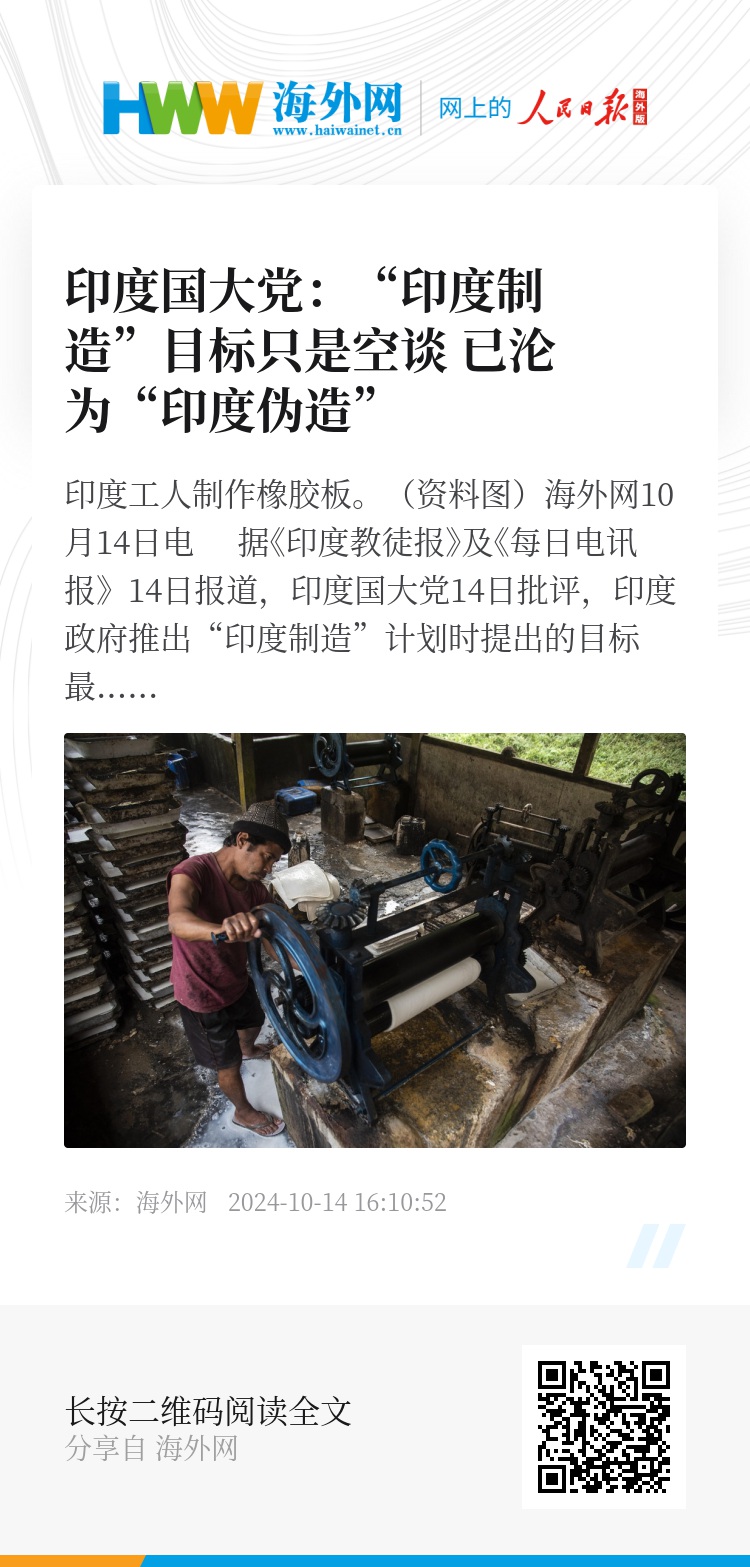 海外网10月14日电 据《印度教徒报》及《每日电讯报》14日报道,印度国大党14日批评,印度政府推出“印度制造”计划时提出的目标最终只是“空谈”,“印度制造”现在已经变成“印度伪造”。