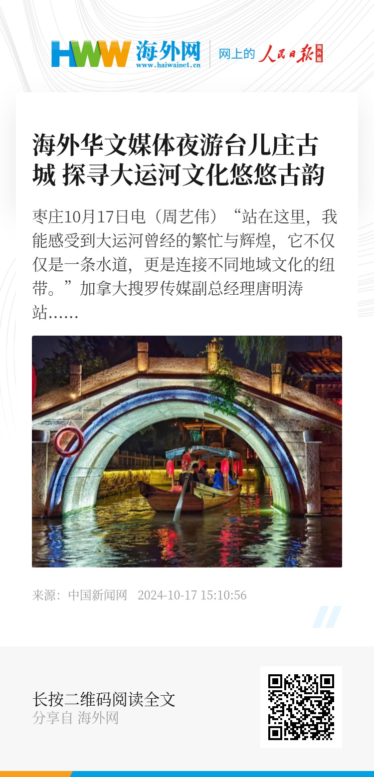 2024海外华文媒体山东行10月14日至20日举行。其间,来自韩国、爱尔兰、德国、意大利等7个国家的9家海外华文媒体代表夜游台儿庄古城,共同探寻这座古城与大运河之间的深厚渊源。