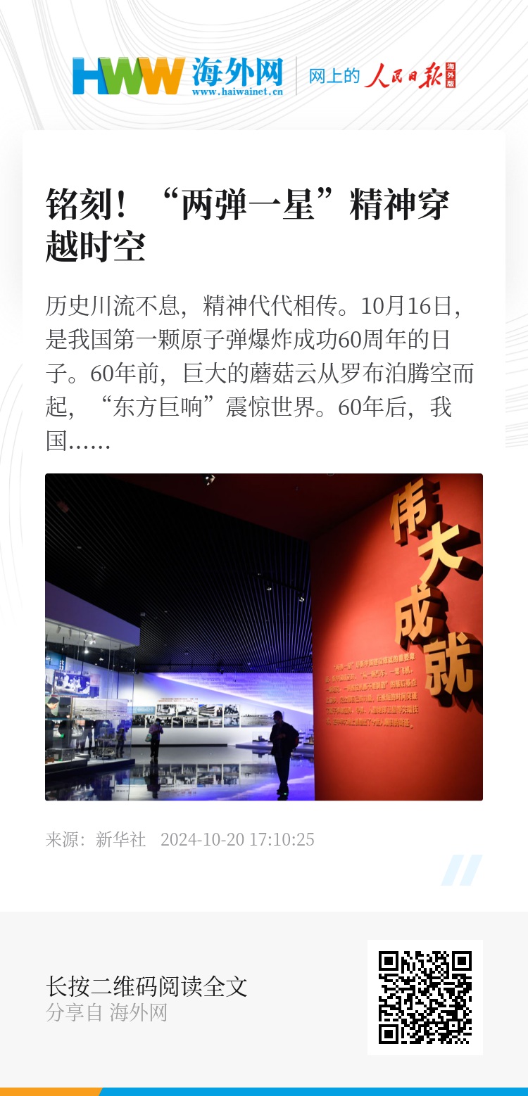 10月16日,是我国第一颗原子弹爆炸成功60周年的日子。60年前,巨大的蘑菇云从罗布泊腾空而起,“东方巨响”震惊世界。60年后,我国建设的第一个核武器研制基地中国原子城里,参观纪念的人们络绎不绝,人们追寻铭刻在新中国史册上的“两弹一星”精神,感受中国共产党人精神谱系中蕴含的巨大力量。