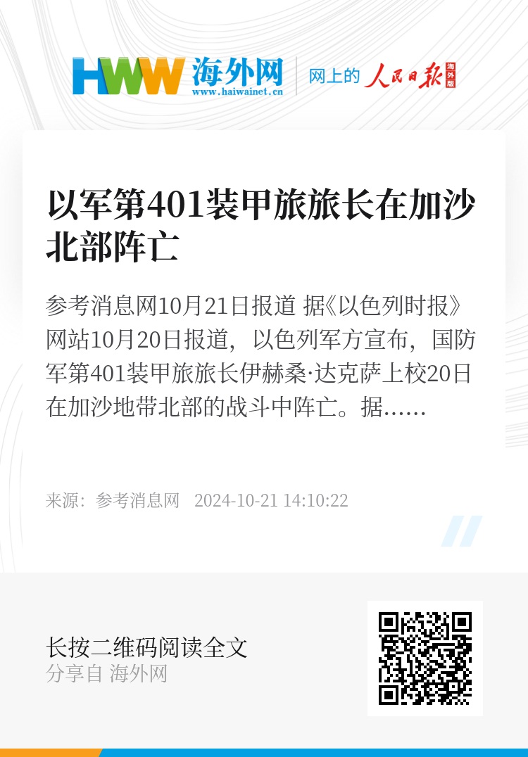 参考消息网10月21日报道 据《以色列时报》网站10月20日报道,以色列军方宣布,国防军第401装甲旅旅长伊赫桑·达克萨上校20日在加沙地带北部的战斗中阵亡。