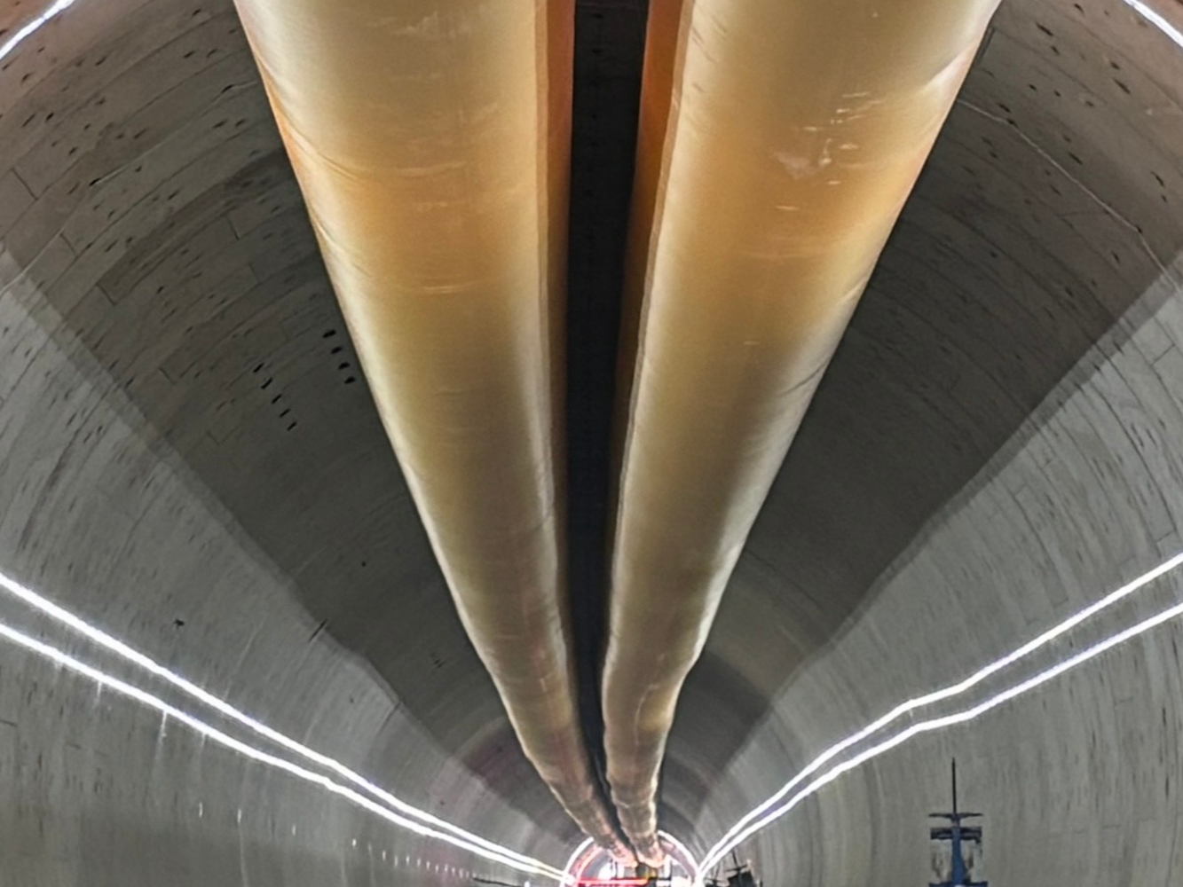 崇太长江隧道崇明区3号井至太仓市2号井盾构段采用“领航号”盾构机掘进施工,该盾构机总长128米,总重约4000吨,刀盘直径15.4米,由北向南独头掘进。为确保盾构机高效顺利掘进,项目团队依集合先进的盾构设计制造理念,应用数字孪生与仿真等先进技术,形成智能建造体系,将智能化理念、技术深度嵌入隧道建造全过程,推动形成新质生产力。目前隧道掘进至1000环,“领航号”盾构机已越过长江北岸大堤进入长江1108米,所处的地质具有含硬质胶结物、水下强弱透水地层交替、冲淤变化交替并伴有有害气体涌出等特点,每掘进2米即完成一环管片的拼装,建成后的隧道浑然一体。
