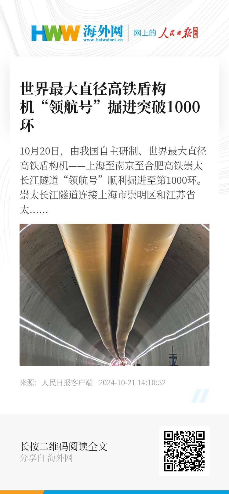 10月20日,由我国自主研制、世界最大直径高铁盾构机——上海至南京至合肥高铁崇太长江隧道“领航号”顺利掘进至第1000环。