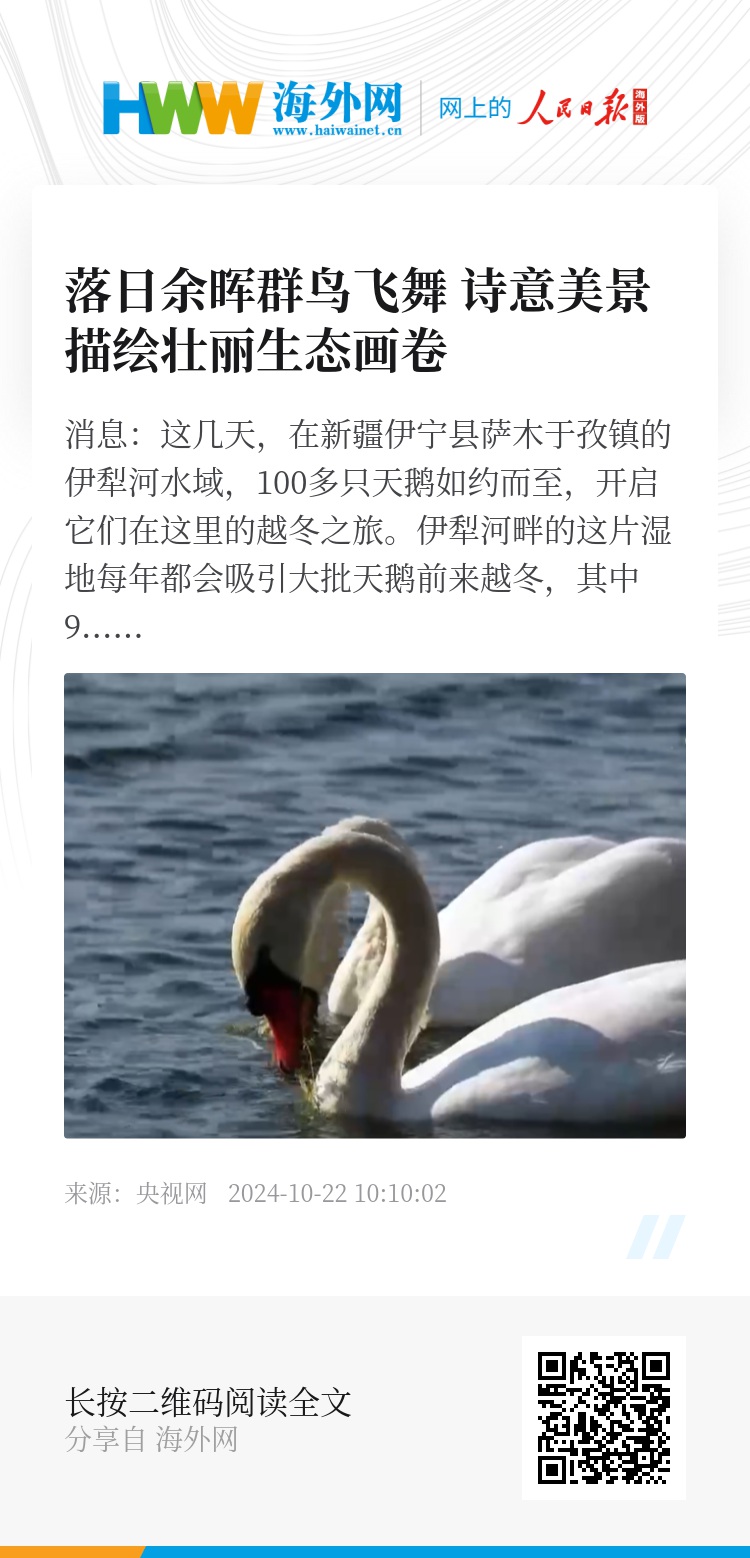 央视网消息:这几天,在新疆伊宁县萨木于孜镇的伊犁河水域,100多只天鹅如约而至,开启它们在这里的越冬之旅。伊犁河畔的这片湿地每年都会吸引大批天鹅前来越冬,其中95%左右都是国家二级保护动物——疣鼻天鹅。