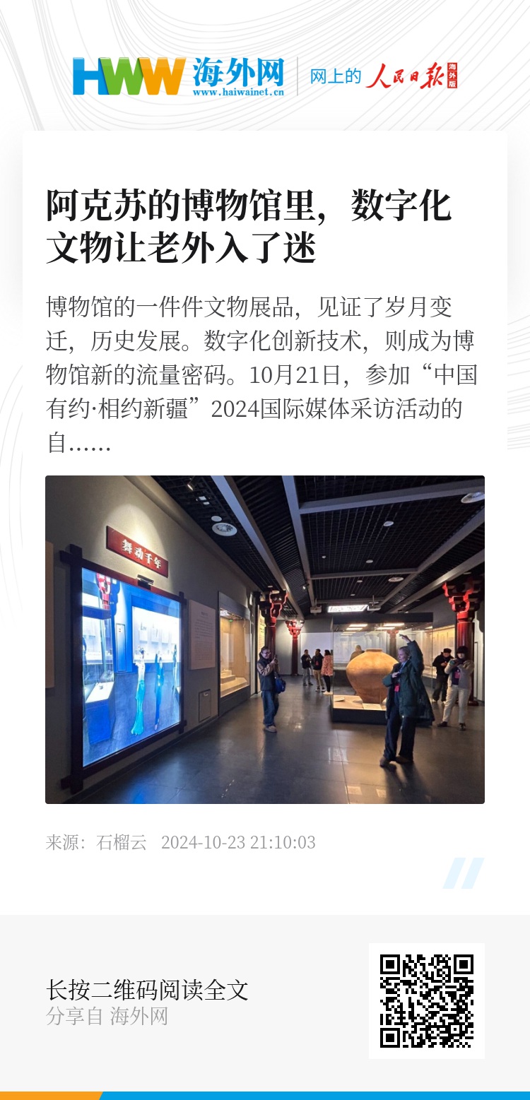 博物馆的一件件文物展品,见证了岁月变迁,历史发展。数字化创新技术,则成为博物馆新的流量密码。10月21日,参加“中国有约·相约新疆”2024国际媒体采访活动的自媒体创作者们来到阿克苏地区文博院(博物馆),解读和感悟一段段历史文化。