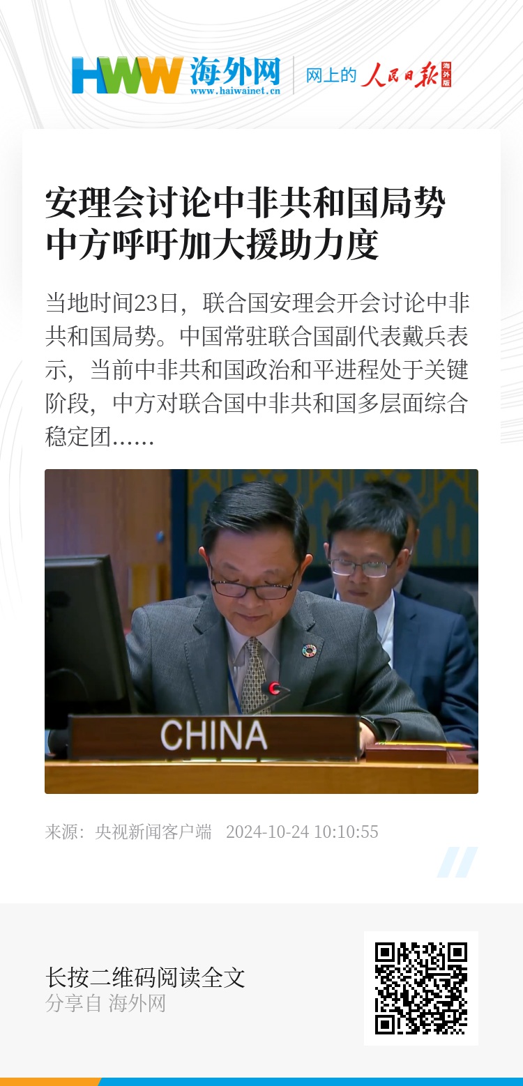 中国常驻联合国副代表戴兵指出,要支持中非共和国推动政治和平进程,帮助中非应对安全挑战,支持中非夯实和平根基。