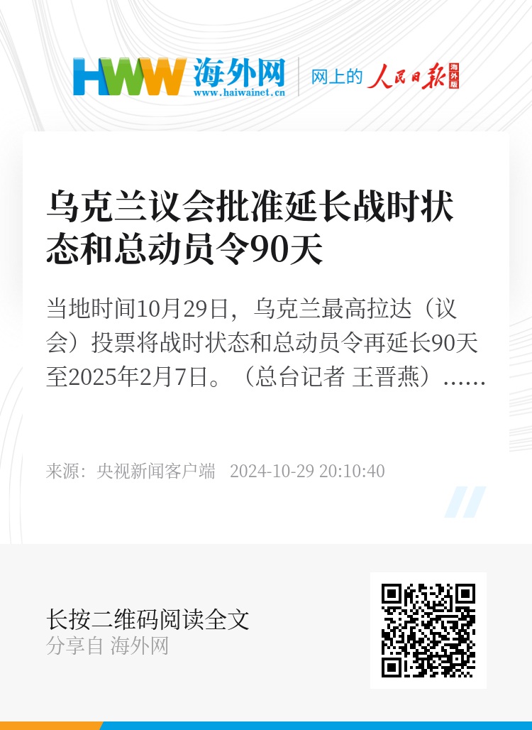 当地时间10月29日,乌克兰最高拉达(议会)投票将战时状态和总动员令再延长90天至2025年2月7日。(总台记者 王晋燕)
