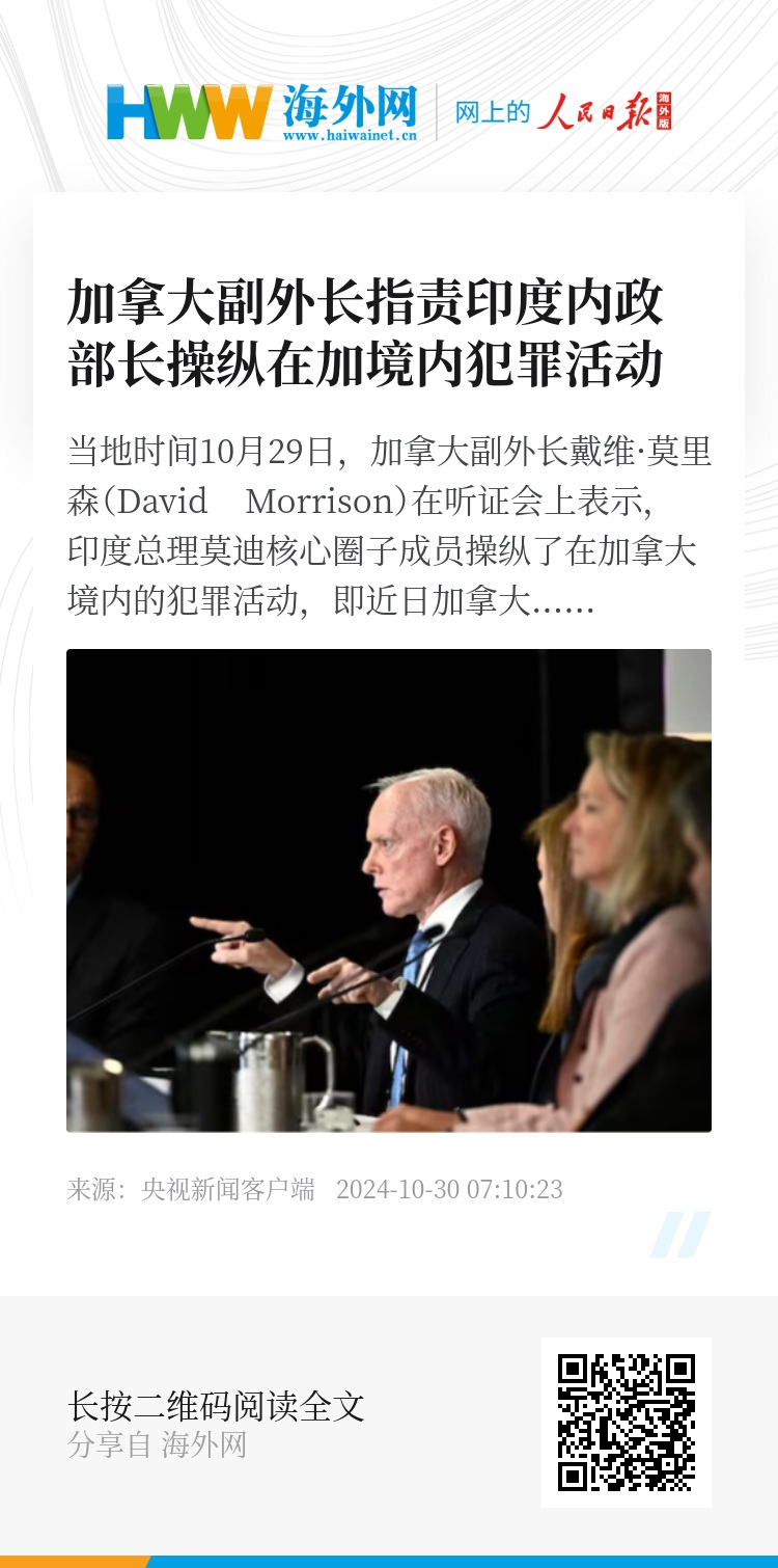 当地时间10月29日,加拿大副外长戴维·莫里森(David Morrison)在听证会上表示,印度总理莫迪核心圈子成员操纵了在加拿大境内的犯罪活动,即近日加拿大警方指控印度外交人员所涉恐吓、勒索与谋杀案件。