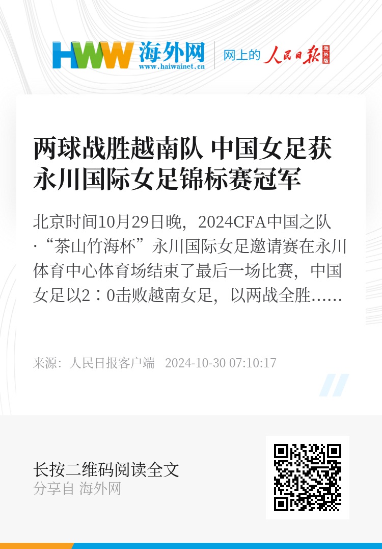 北京时间10月29日晚,2024CFA中国之队·“茶山竹海杯”永川国际女足邀请赛在永川体育中心体育场结束了最后一场比赛,中国女足以2∶0击败越南女足,以两战全胜的成绩夺得了本届比赛的冠军。