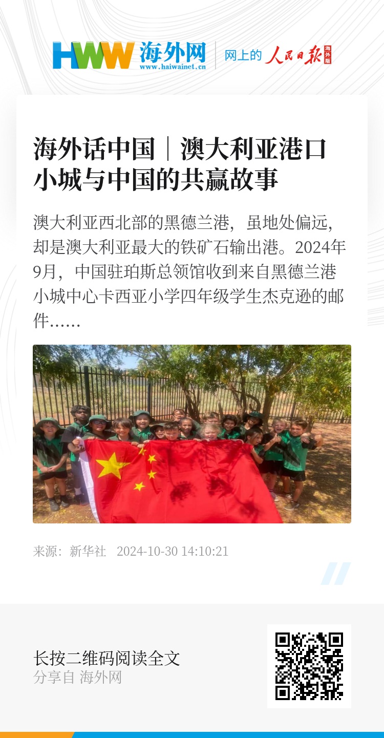 2024年9月,中国驻珀斯总领馆收到来自黑德兰港小城中心卡西亚小学四年级学生杰克逊的邮件,杰克逊说他对中国很感兴趣。总领馆马上安排寄去了精心挑选的国旗和图书等纪念品,并回复邮件向杰克逊介绍了中国的美景、美食和历史故事等。