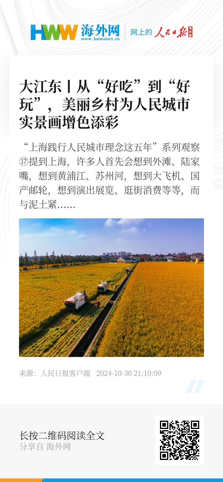 大米、葡萄、水蜜桃、大闸蟹……一年四季轮番上市的这些“小而美”地产农产品,不仅是时令美味,更凝结着浓浓的乡愁,共同组成了“好吃”的上海。而家庭农场、社区农业、露营地、郊野公园等丰富的农文旅项目,也让上海的乡村变得越来越“好玩”。