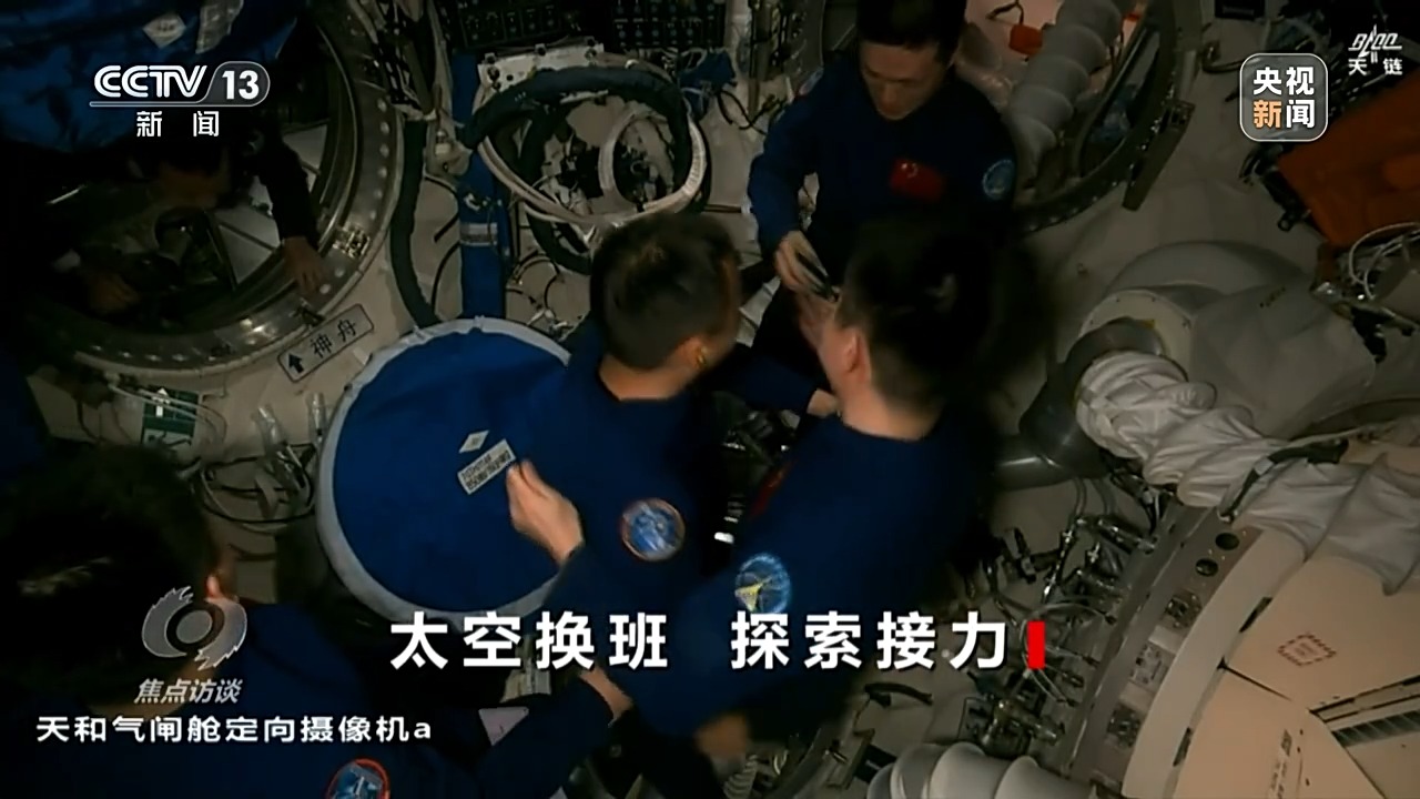 重返中国空间站的神十九航天员蔡旭哲打开舱门,再次体验失重,他轻松地就从飞船进入空间站节点舱,和等待他们到来的神十八乘组来了一个大拥抱。第一次进入空间站的两位“90后”航天员也同样受到了热烈的欢迎。在打扫一新的空间站核心舱,欢迎仪式必不可少。