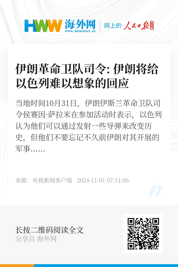 当地时间10月31日,伊朗伊斯兰革命卫队司令侯赛因·萨拉米在参加活动时表示,以色列认为他们可以通过发射一些导弹来改变历史,但他们不要忘记不久前伊朗对其开展的军事行动,伊朗将会给以色列一个“难以想象的回应”。