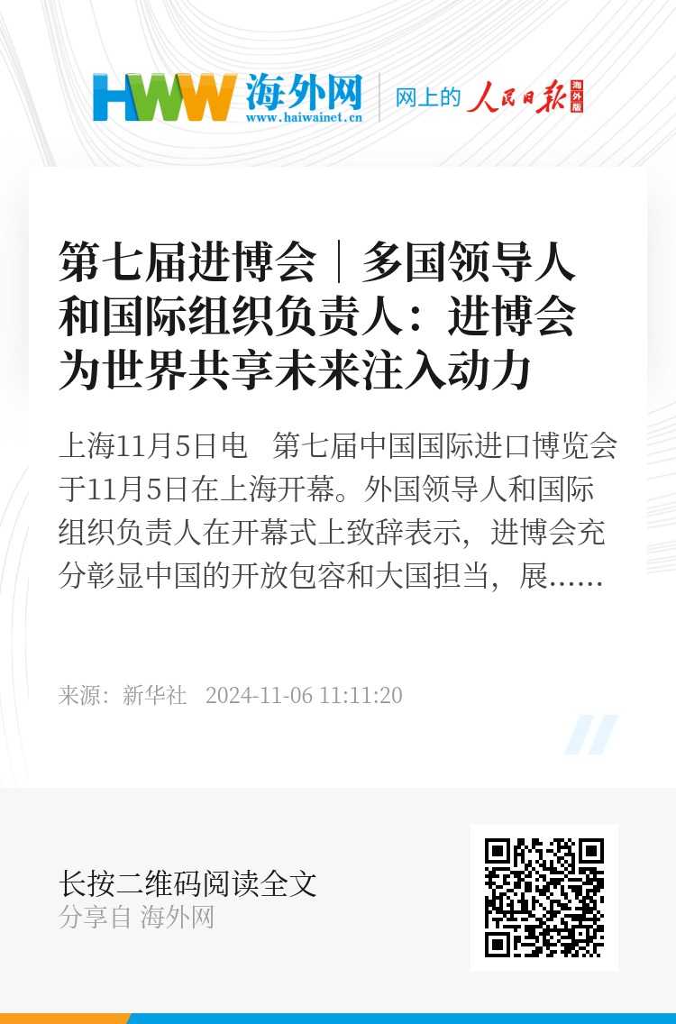 新华社上海11月5日电 第七届中国国际进口博览会于11月5日在上海开幕。外国领导人和国际组织负责人在开幕式上致辞表示,进博会充分彰显中国的开放包容和大国担当,展现中国超大规模市场的魅力,为世界各地企业搭建了合作平台、创造了发展机遇,为促进世界可持续发展、共享美好繁荣的未来注入动力。
