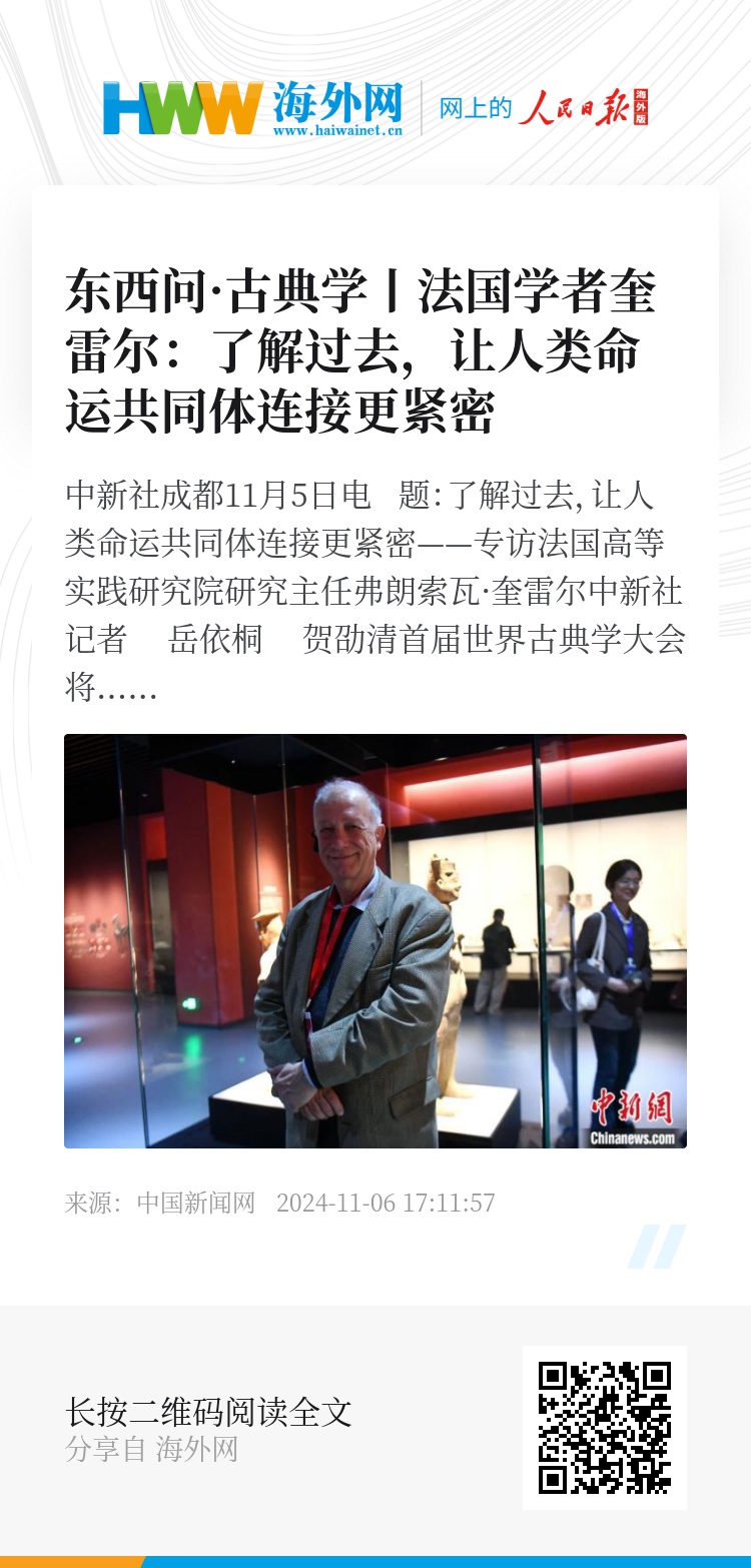 世界古典学大会对东西方文明交流互鉴有何帮助?古典学研究有何当代意义?全球化趋势下,应如何构建人类命运共同体?走访四川期间,首届世界古典学大会的外方嘉宾之一、法国高等实践研究院研究主任弗朗索瓦·奎雷尔(François Queyrel)接受中新社“东西问”独家专访,对此进行解读。