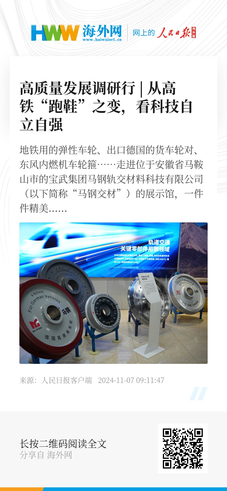 眼下,马钢正在着手时速400公里高速车轮的研发工作。面对未来,鲁松充满信心:“我们的目标就是成为轮轴产业的领军企业,让更多中国高铁穿上国产‘跑鞋’!”(人民日报客户端安徽频道 罗阳奇 王锐)