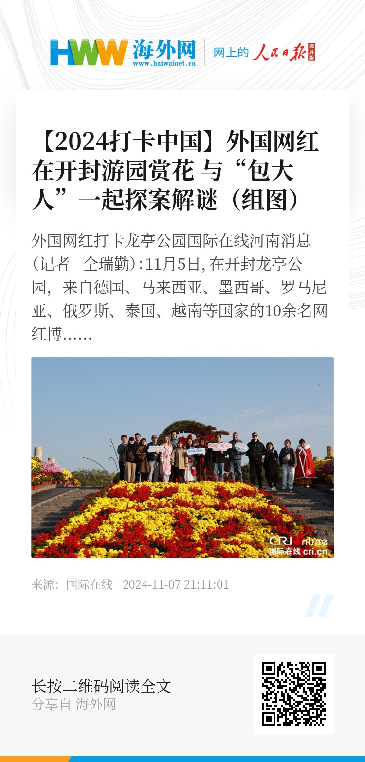 国际在线河南消息(记者 仝瑞勤):11月5日,在开封龙亭公园,来自德国、马来西亚、墨西哥、罗马尼亚、俄罗斯、泰国、越南等国家的10余名网红博主及总台捷克语鼹鼠工作室主播,沿着由各类各色菊花装扮而成的“花路”拾阶而上,身临其境漫游菊海,感受宋代宫廷文化。