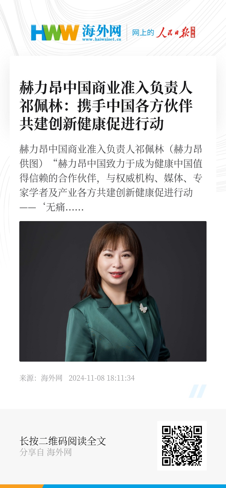 “赫力昂中国致力于成为健康中国值得信赖的合作伙伴,与权威机构、媒体、专家学者及产业各方共建创新健康促进行动——‘无痛中国’行动、‘骨动中国’及‘健齿中国行’。”赫力昂中国商业准入负责人祁佩林日前接受人民日报海外网书面专访时表示。