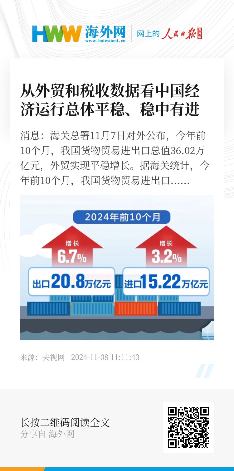 央视网消息:海关总署11月7日对外公布,今年前10个月,我国货物贸易进出口总值36.02万亿元,外贸实现平稳增长。