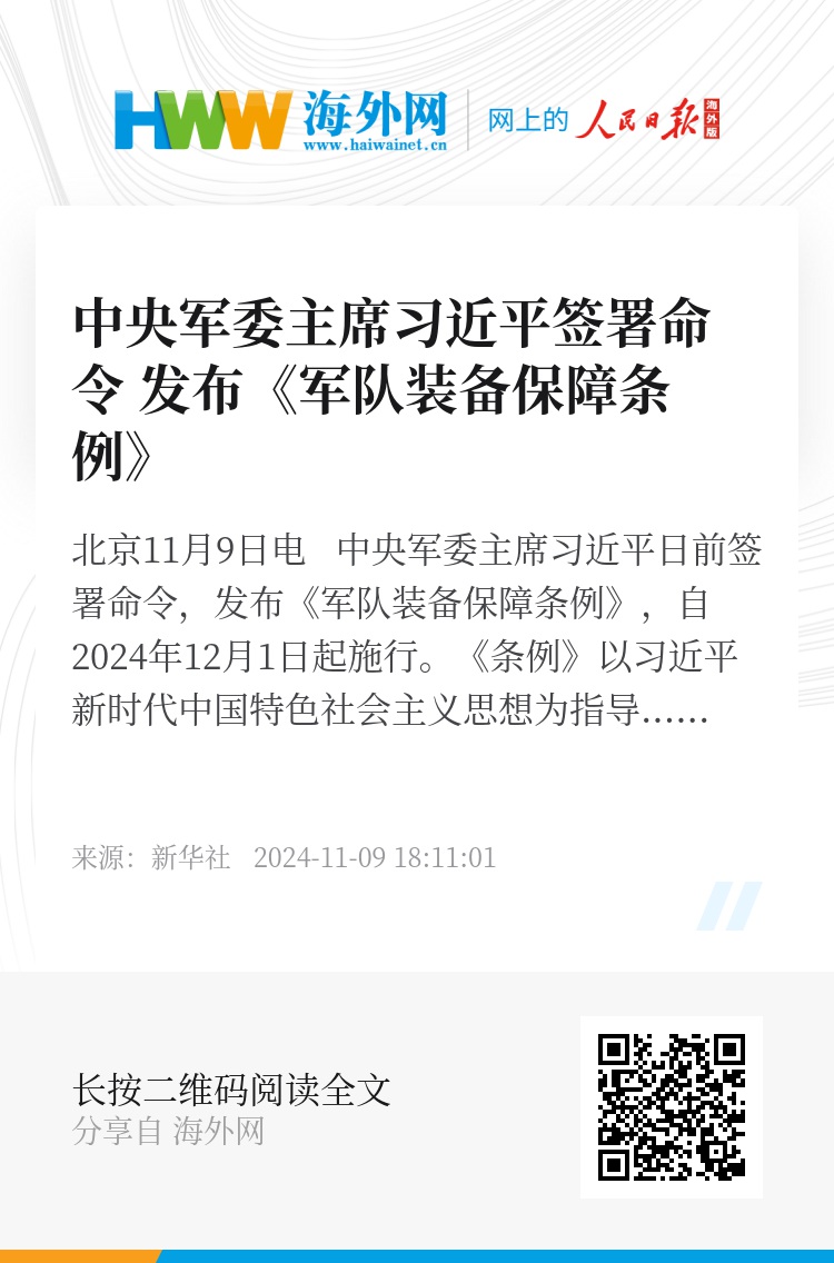 新华社北京11月9日电 中央军委主席习近平日前签署命令,发布《军队装备保障条例》,自2024年12月1日起施行。