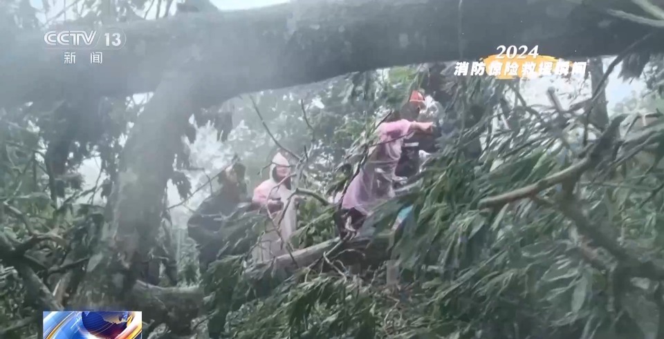 消防员边切割倒下的树木,边寻找空隙艰难行进。终于抵达群众被困的地方,几名消防员前后护卫,带着被困人员翻过围栏、穿越荆棘破障前行。