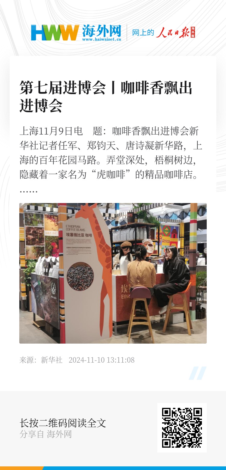 埃塞俄比亚咖啡是多届进博会的“明星产品”,2018年搭上“进博快车”后,市场不断扩大。在本届进博会期间发布的《2024中国进口咖啡贸易报告》显示,埃塞俄比亚已经成为中国第二大咖啡生豆进口国,2023年,中国从埃塞俄比亚进口了2.2万吨咖啡生豆,约占中国进口咖啡生豆总量的16%。