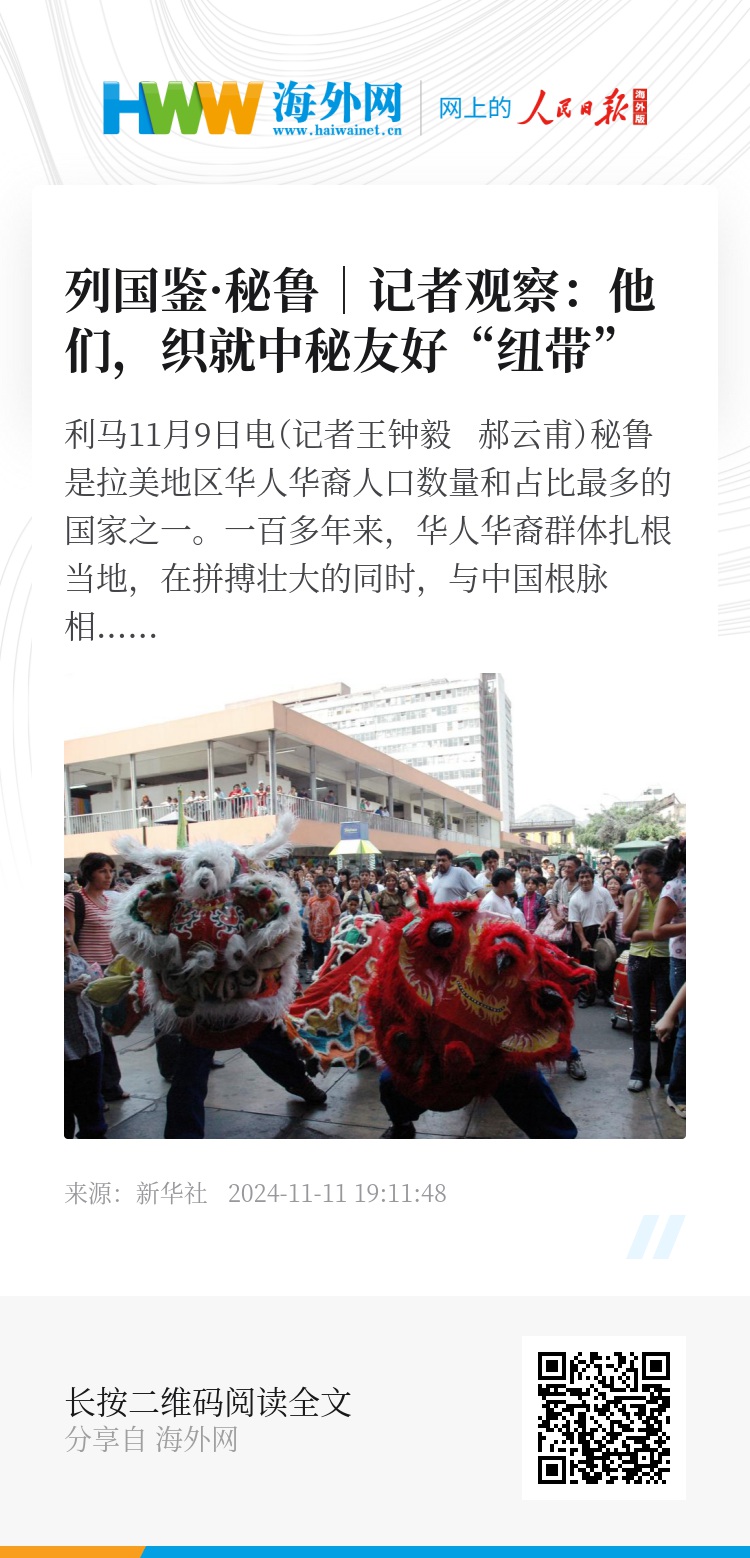 新华社利马11月9日电(记者王钟毅 郝云甫)秘鲁是拉美地区华人华裔人口数量和占比最多的国家之一。一百多年来,华人华裔群体扎根当地,在拼搏壮大的同时,与中国根脉相连,对中秘关系稳定发展发挥着重要作用。