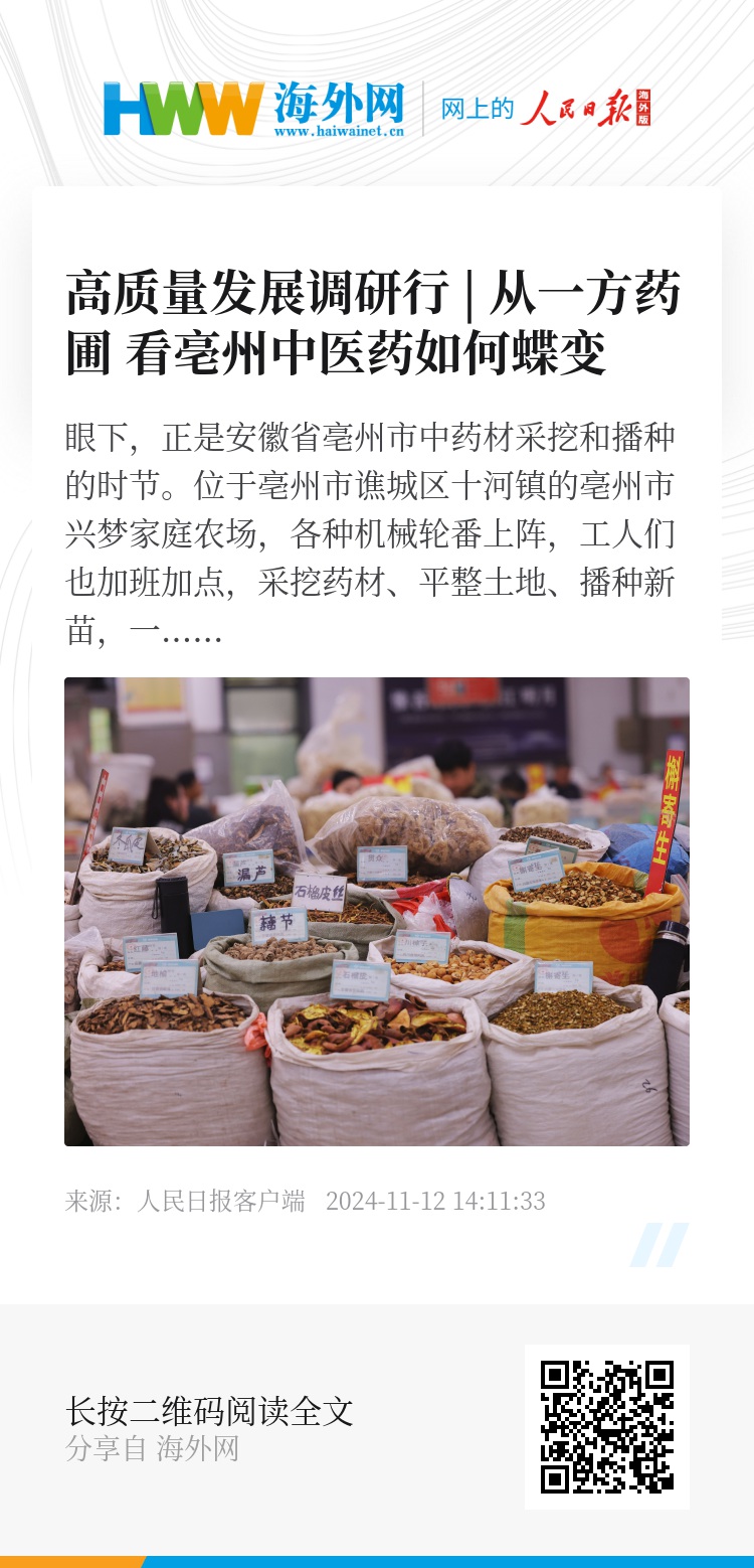 此外,亳州中医药产品还远销海外,今年上半年,亳州市中药材进出口额3.8亿元,增长14.9%,占全省89.41%、全国7.39%。2023年以来中药材进出口实绩企业91家,业务覆盖88个国家和地区。