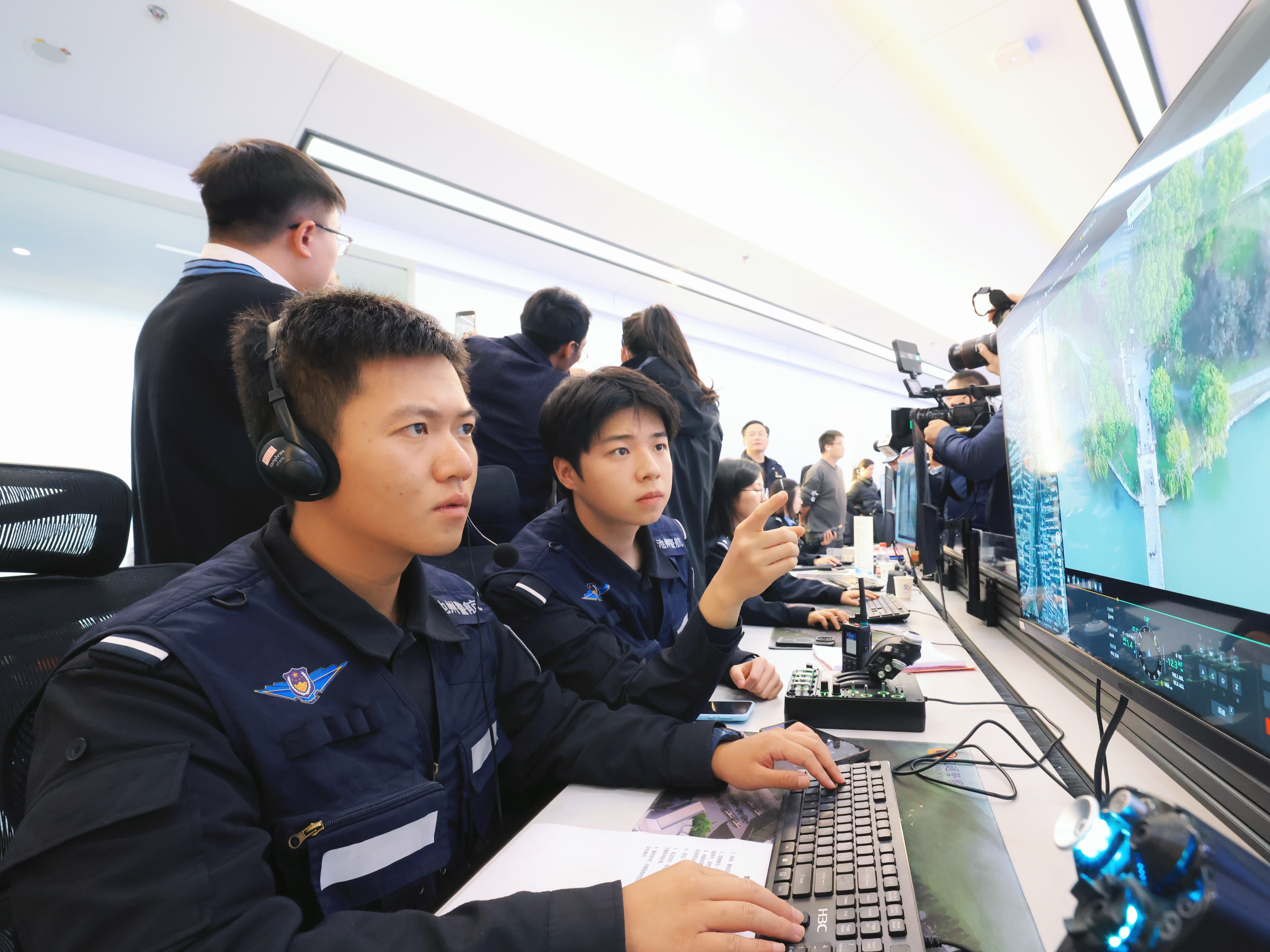 接下来的情节便如同影视画面。两位接线员,一位与报警人确认各种信息,一位根据系统提示,通知附近的各个警种赶赴现场。随即,民警执法记录仪、道路监控以及增派无人机拍摄的实时画面,都在大屏上清晰展现,随时切换。指挥中心发出的指令此起彼伏,前后方配合无缝对接。