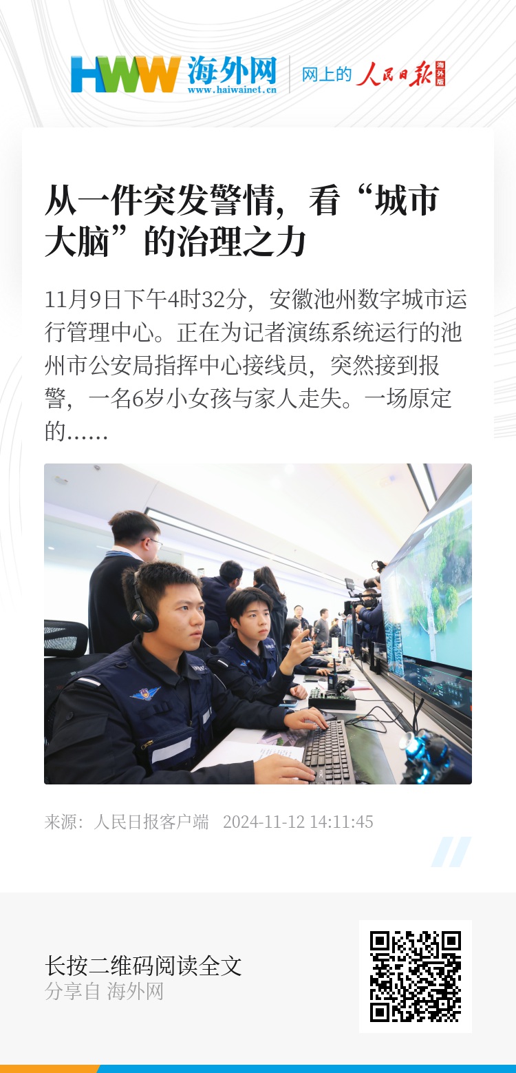 “未来,我们将进一步推动更多业务系统和前端感知设备接入数字城市运行管理中心,利用可视化、AI大模型等技术手段,强化城市生命体征监测预警能力和应急处置能力,探索城市治理的新模式。”吴文舟说。(人民日报客户端安徽频道 罗阳奇 王锐)