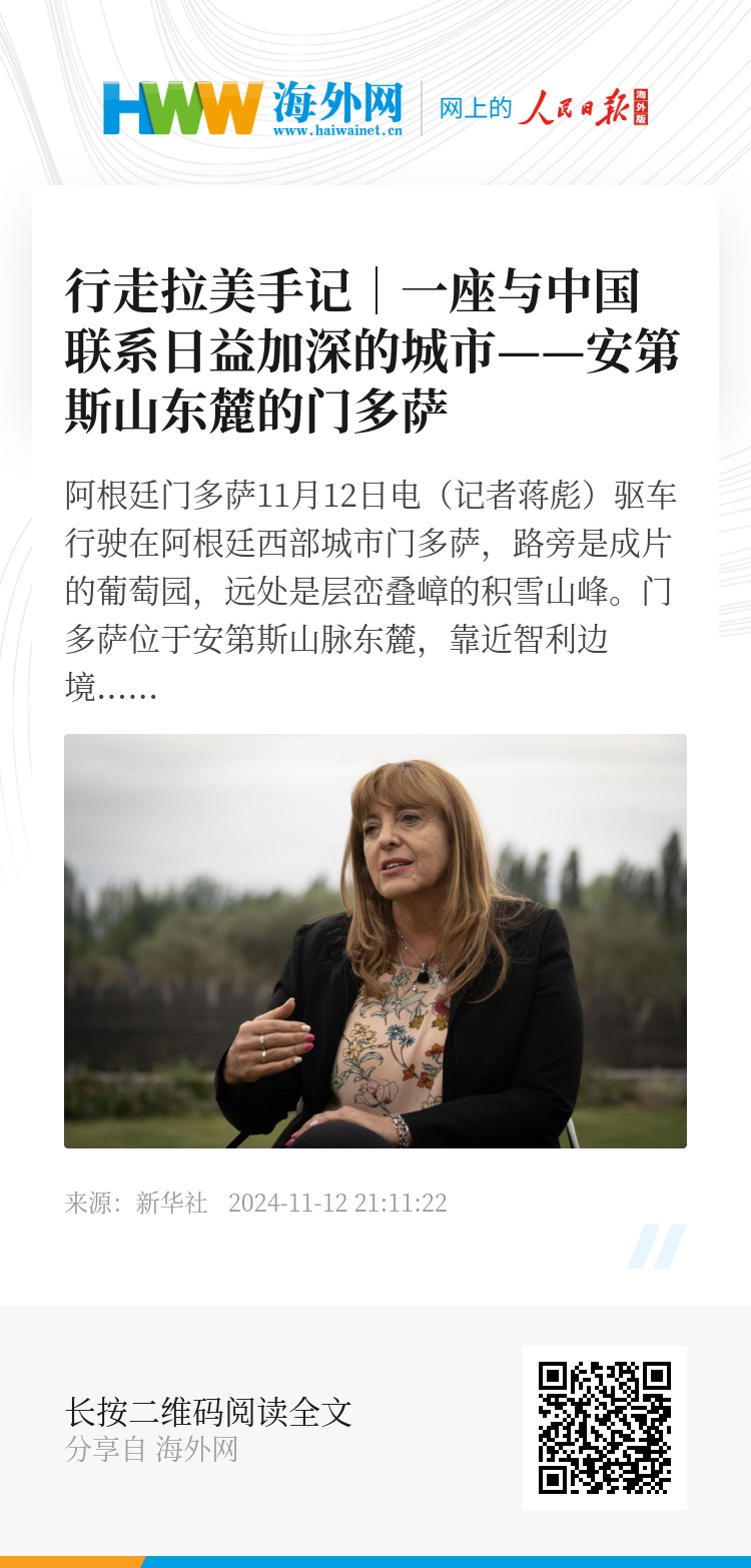 据该机构2023年统计报告,门多萨省去年共向中国出口价值约3900万美元的葡萄酒、橄榄油、樱桃等产品。“我们正努力解决物流成本等问题,希望在中国市场占据更重要位置。”希门尼斯说。