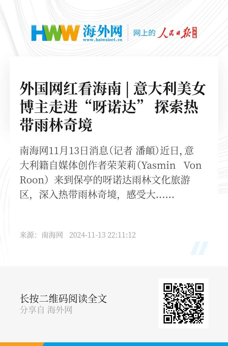 南海网11月13日消息(记者 潘頔)近日,意大利籍自媒体创作者荣茉莉(Yasmin Von Roon)来到保亭的呀诺达雨林文化旅游区,深入热带雨林奇境,感受大自然的魅力。