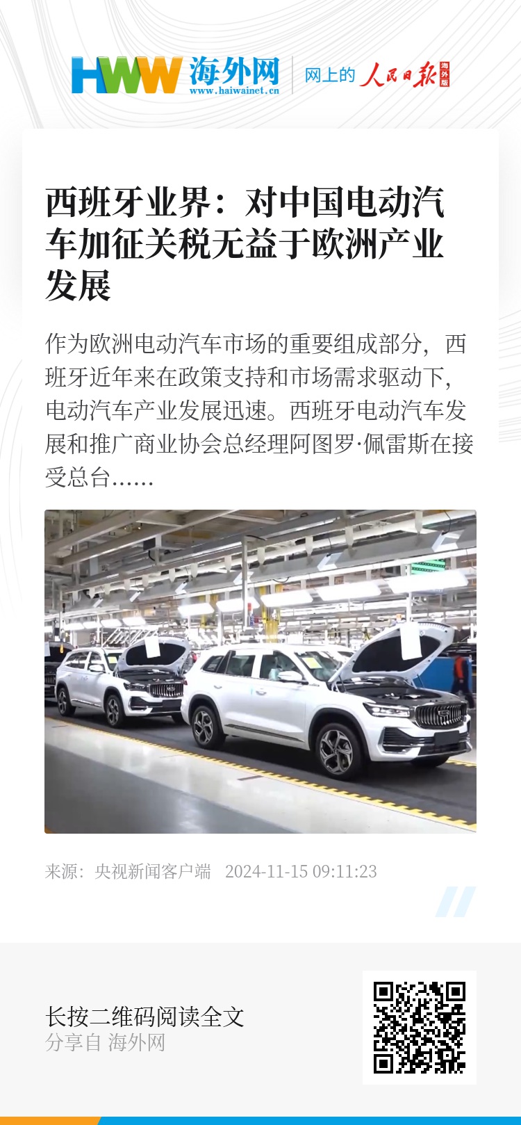 作为欧洲电动汽车市场的重要组成部分,西班牙近年来在政策支持和市场需求驱动下,电动汽车产业发展迅速。西班牙电动汽车发展和推广商业协会总经理阿图罗·佩雷斯在接受总台记者采访时表示,欧盟对中国电动汽车加征关税的举措无助于欧洲本土的产业发展,他强调欧洲需要更多与中国的合作与交流。
