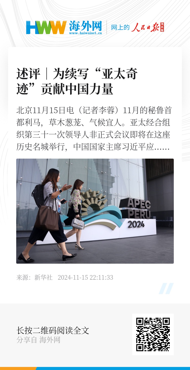 新华社北京11月15日电(记者李蓉)11月的秘鲁首都利马,草木葱茏、气候宜人。亚太经合组织第三十一次领导人非正式会议即将在这座历史名城举行,中国国家主席习近平应邀出席。围绕“赋能、包容、增长”这一主题,会议将进行深入探讨,共同擘画亚太地区包容增长、合作发展新蓝图。