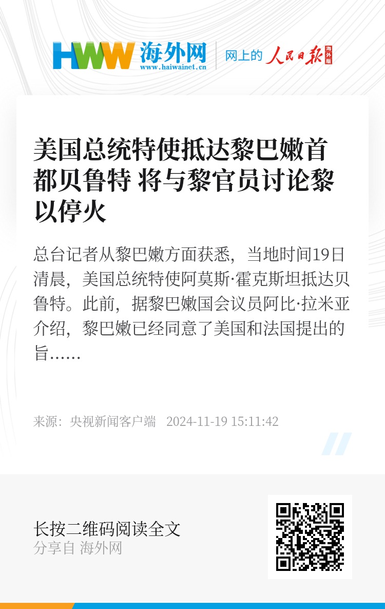 此前,据黎巴嫩国会议员阿比·拉米亚介绍,黎巴嫩已经同意了美国和法国提出的旨在实现停火的建议,正在等待霍克斯坦抵达黎巴嫩并与总理米卡提及议会议长在贝鲁特会晤。在黎巴嫩之行后,霍克斯坦还将前往以色列,了解以色列方面的最终答案。(总台记者 次晓宁)