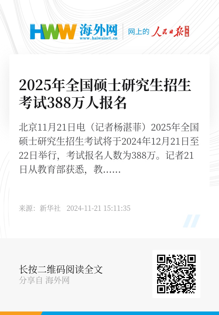 新华社北京11月21日电(记者杨湛菲)2025年全国硕士研究生招生考试将于2024年12月21日至22日举行,考试报名人数为388万。记者21日从教育部获悉,教育部近日会同国家教育统一考试工作部际联席会议有关成员单位,召开2025年全国硕士研究生招生考试安全工作视频会议,全面动员和部署做好考试安全工作。