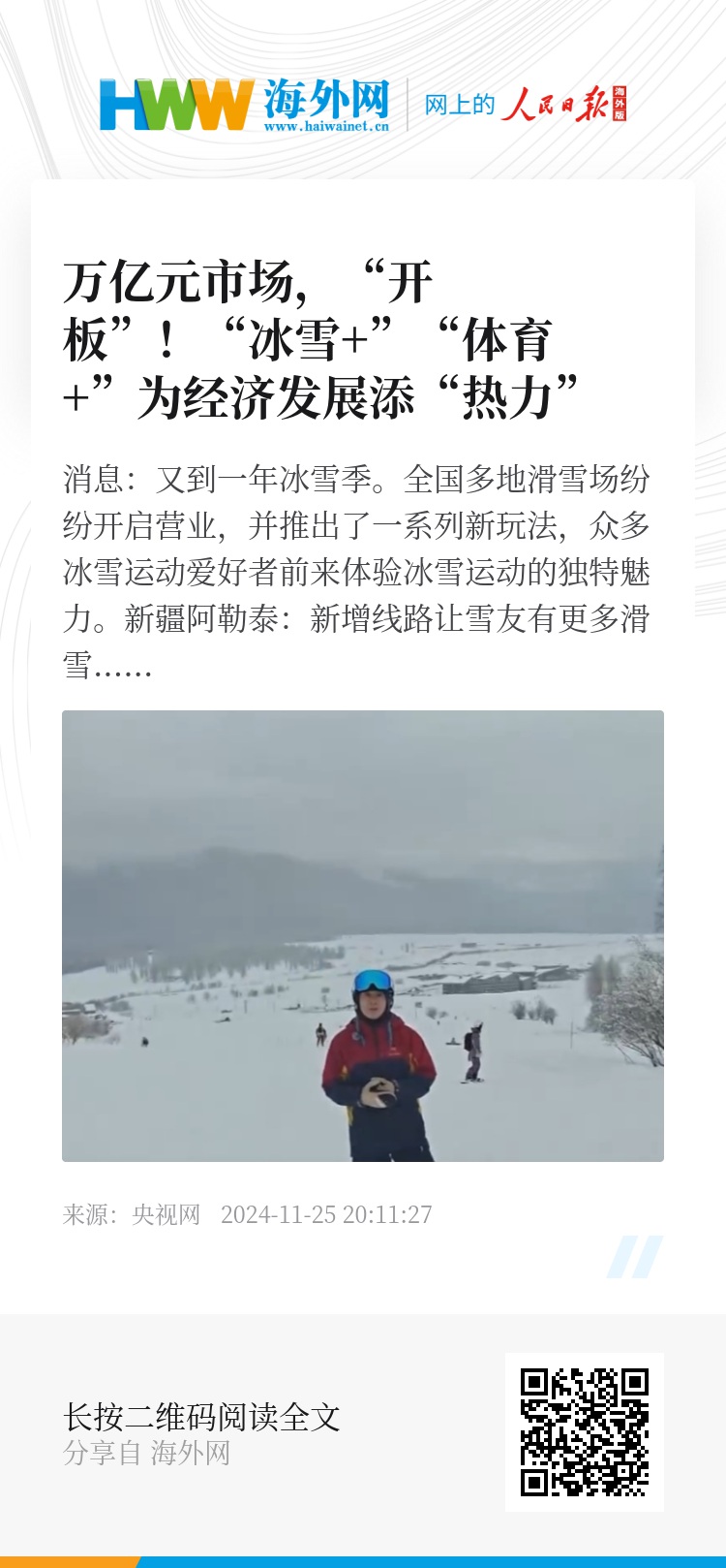 11月6日,国务院办公厅发布《关于以冰雪运动高质量发展激发冰雪经济活力的若干意见》,要求持续巩固和扩大“带动三亿人参与冰雪运动”成果。以冰雪运动为引领,带动冰雪文化、冰雪装备、冰雪旅游全产业链发展,推动冰雪经济成为新增长点。