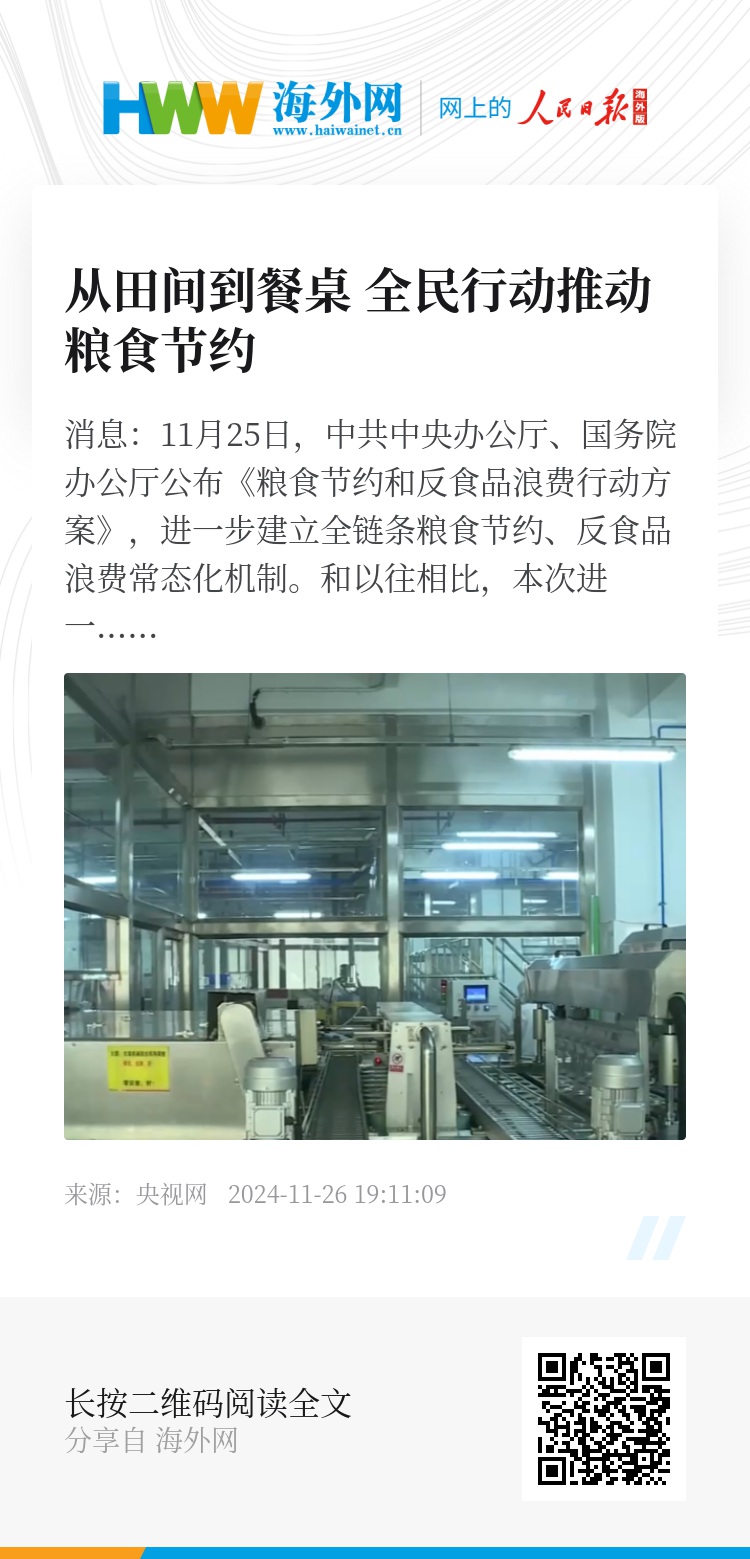 央视网消息:11月25日,中共中央办公厅、国务院办公厅公布《粮食节约和反食品浪费行动方案》,进一步建立全链条粮食节约、反食品浪费常态化机制。