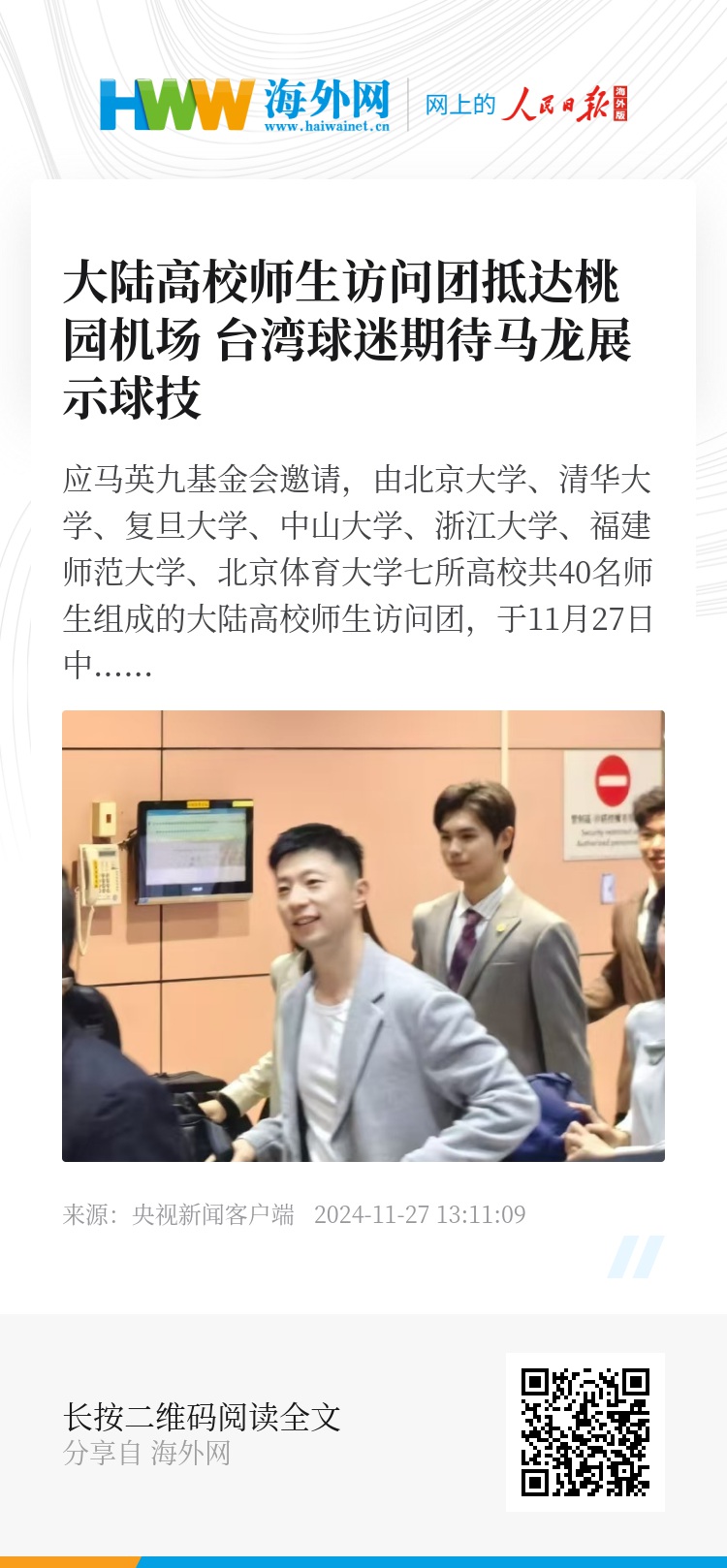 应马英九基金会邀请,由北京大学、清华大学、复旦大学、中山大学、浙江大学、福建师范大学、北京体育大学七所高校共40名师生组成的大陆高校师生访问团,于11月27日中午11时左右抵达台湾桃园机场,展开九天八夜的参访活动。访问团在机场受到台湾各界的热烈欢迎,成员中最受瞩目的是获得6枚奥运金牌的乒乓球运动员马龙和东京奥运会射击冠军杨倩。