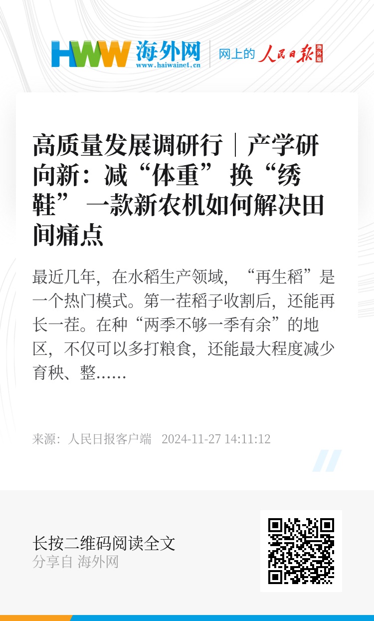 事实上,随着高质量发展调研组在湖南的采访不断深入,记者发现,在产学研协同,研用推一体的模式下,越来越多的农业装备,都像这款再生稻收割机一样,正在从“有机可用”,向“有好机用”坚定迈进。(人民日报客户端湖南频道 孙超 叶子)
