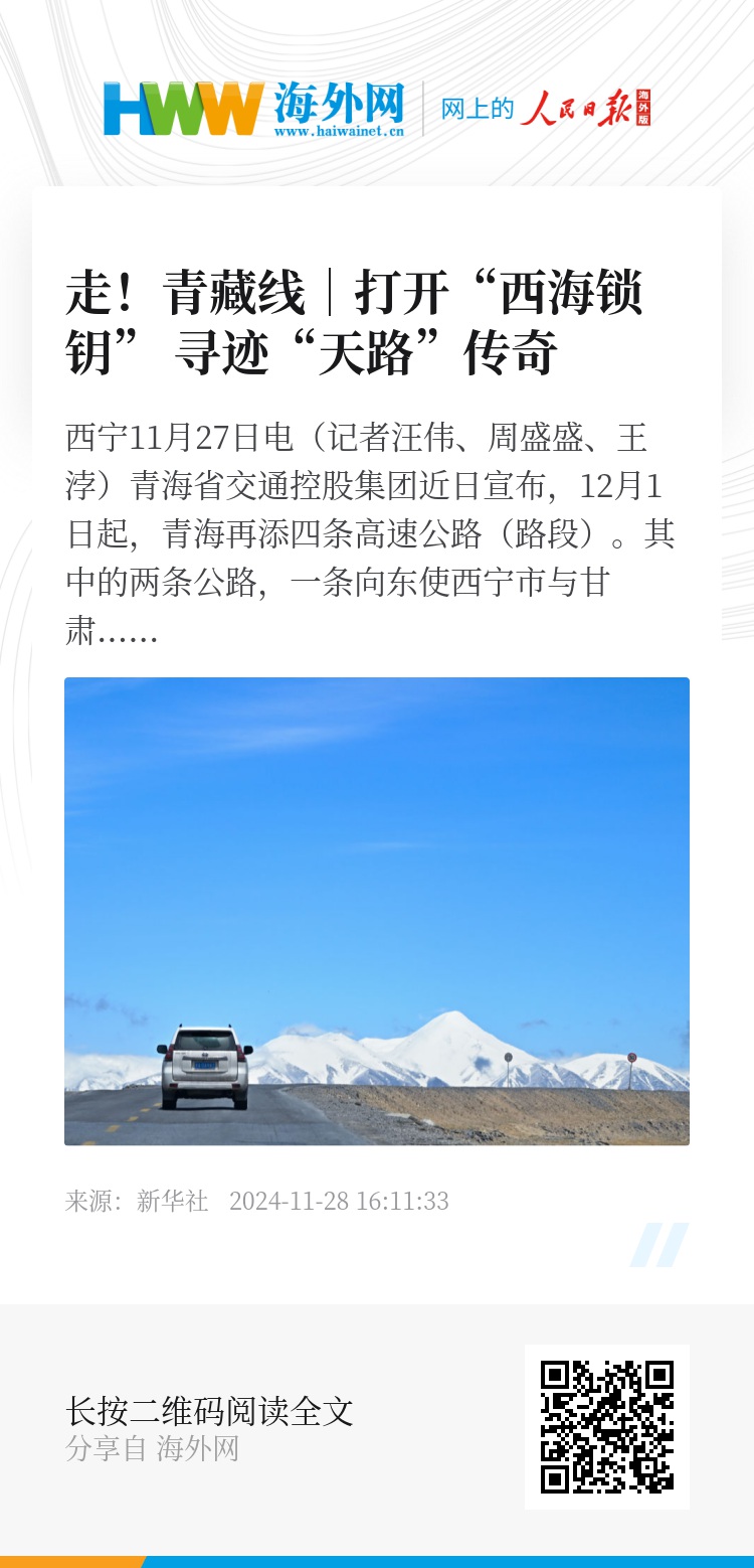 新华社西宁11月27日电(记者汪伟、周盛盛、王浡)青海省交通控股集团近日宣布,12月1日起,青海再添四条高速公路(路段)。其中的两条公路,一条向东使西宁市与甘肃省兰州市联系更加紧密;一条向西串起金银滩、原子城、青海湖等黄金旅游地。
